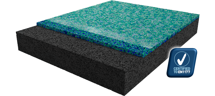 Dvoslojni vodonepropusni sustav podloga za dječja igrališta namjenjen za zatvorene prostore. Ovaj susta na površini ima dodatanu transparentnu zaštitu koja kao završni sloj brtvi pore, te spriječava nakupljanje šporkice i prašine na gornjem sloju granulata.